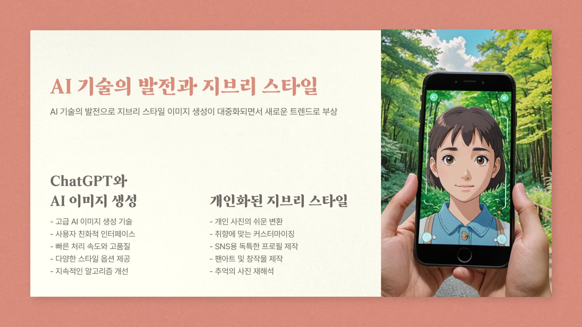 과거에는 사진을 애니메이션 스타일로 변환하려면 고도의 그래픽 작업이 필요했지만, 최근 AI 기술이 발전하면서 누 구나 쉽게 지브리 스타일 사진을 만들 수 있게 되었다. 대표적인 AI 기반 이미지 변환 기술로는 딥러닝을 활용한 스타일 트랜스퍼(Style Transfer) 기법이 있으며, 이를 통해 일반 사진을 지브리 애니메이션풍으로 바꿀 수 있다.